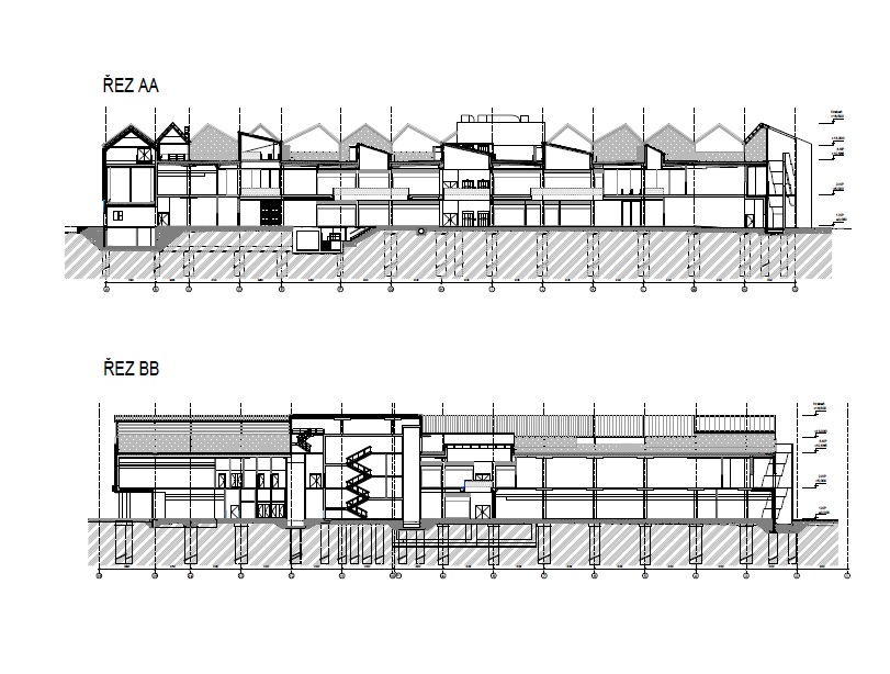 a priestupy do pasáže. V dvoch miestach potom sedlovými strechami prestupuje
