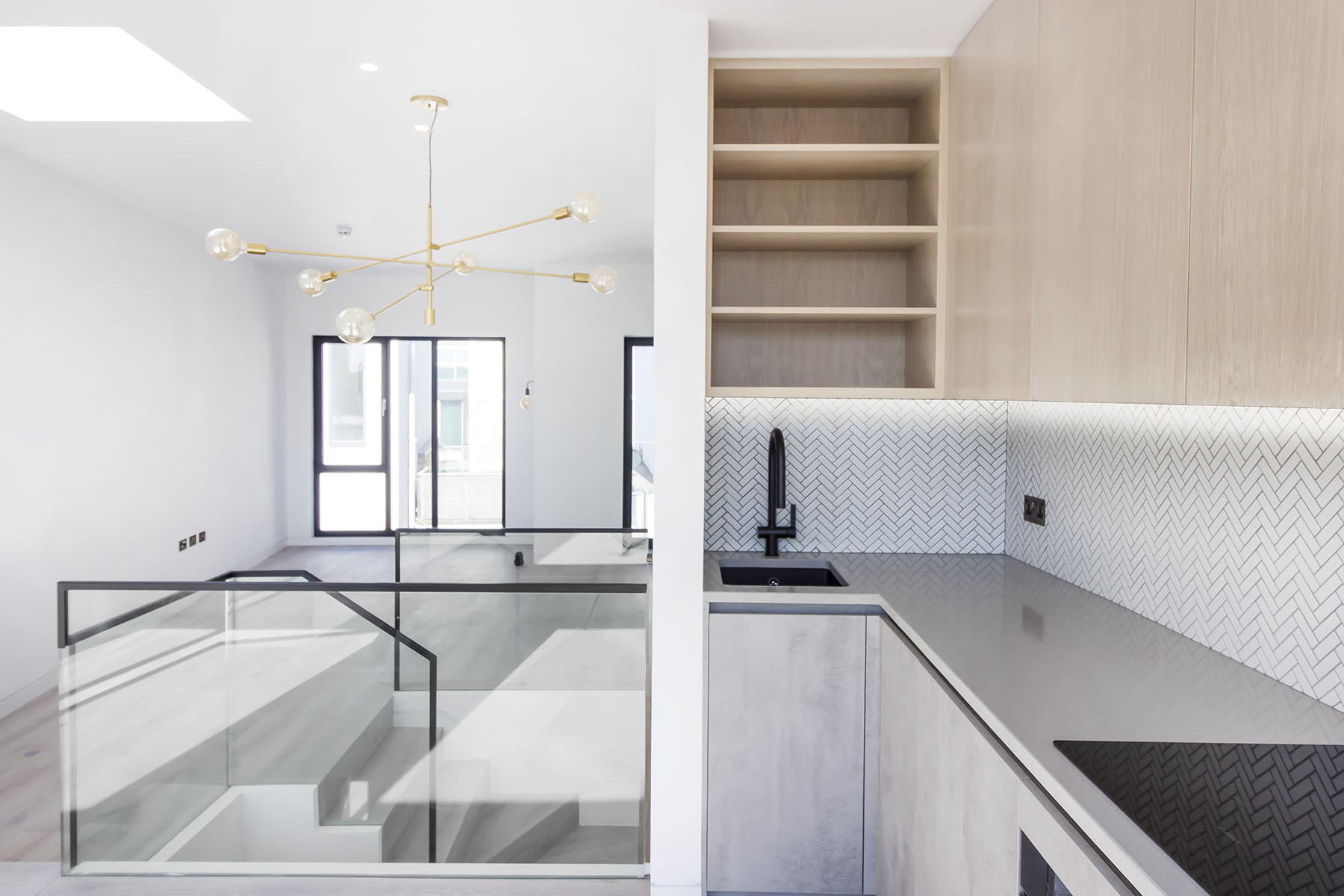 sme pracovali sme s tehlovými obkladmi natretými na bielo a svetlými drevenými