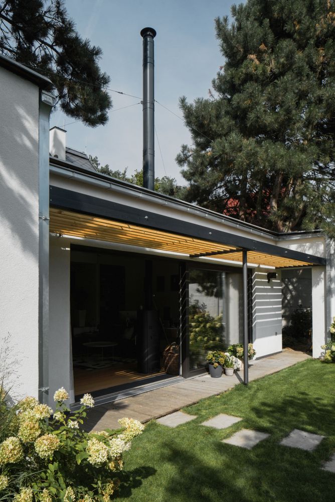 Dům byl postaven v šedesátých letech na pozemku se vzrostlými stromy a keři. V roce 2013 získali objekt noví majitelé, kteří se ho rozhodli přizpůsobit svým představám. Objekt se suterénem, přízemím, podkrovím a malou vstupní verandou splňoval jejich představy o novém bydlení, jediným nedostatkem byla absence otevřeného prostoru sloužícího současně jako kuchyně, jídelna, pracovna a obývací pokoj. U stávajícího objektu nebylo vytvoření velkého prostoru z konstrukčních a kapacitních důvodů možné. Odpovědí se stala přístavba při jižní fasádě směrem do zahrady. Jednoduchá hmota s pultovou střechou a s podlahou 20 centimetrů nad terénem navazuje přímo na dům. Důvodem pro zvolené hmotové řešení byla snaha vytvořit v interiéru nový velkorysý prostor s vysokým stropem, ale současně nezakončit přístavbu směrem do drobné zahrady přehnaně vysokým průčelím.