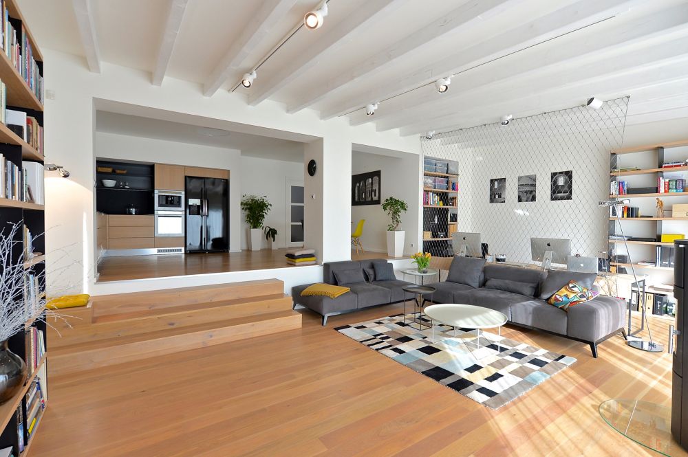 V interiéru přístavba navazuje na stávající kuchyni a obývací pokoj. Nově bude přístavba s těmito místnostmi propojena v jeden velký obytný prostor se dvěma výškovými úrovněmi. Hranici mezi přístavbou a zahradou bude tvořit pět a půl metru široké posuvné okno, za kterým navazuje na obytný prostor sluneční pergola.