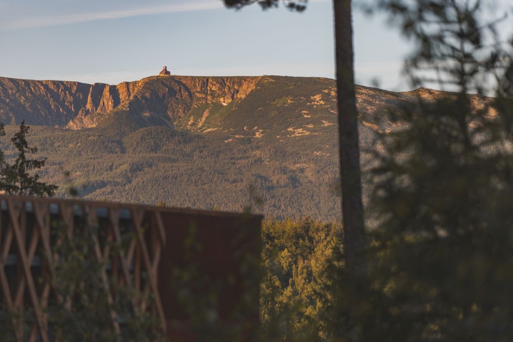 Medvěd se schoval v lese jen kousek od Lišky. Stojí na kusu kamene mezi borůvčím a kouká do korun stromů. Vypadá dobře živený, je ho pořádný kousek. „Vlezte mi na záda!“ Vyzývá Medvěd a zve vás na vyhlídku, která funguje, i když se po horách válí mlha. Když budete mít štěstí, uvidíte datla v akci a když si přivstanete, uvidíte možná i stádo srnek, které se potulují v lesích na vrcholu Stráže. Medvěd je z Dolní Rokytnice, ale vypadá, že se mu tady nahoře líbí. Je tu klid a má rád lidi, tak se nebojte a poslechněte ho. Vlezte mu na záda.