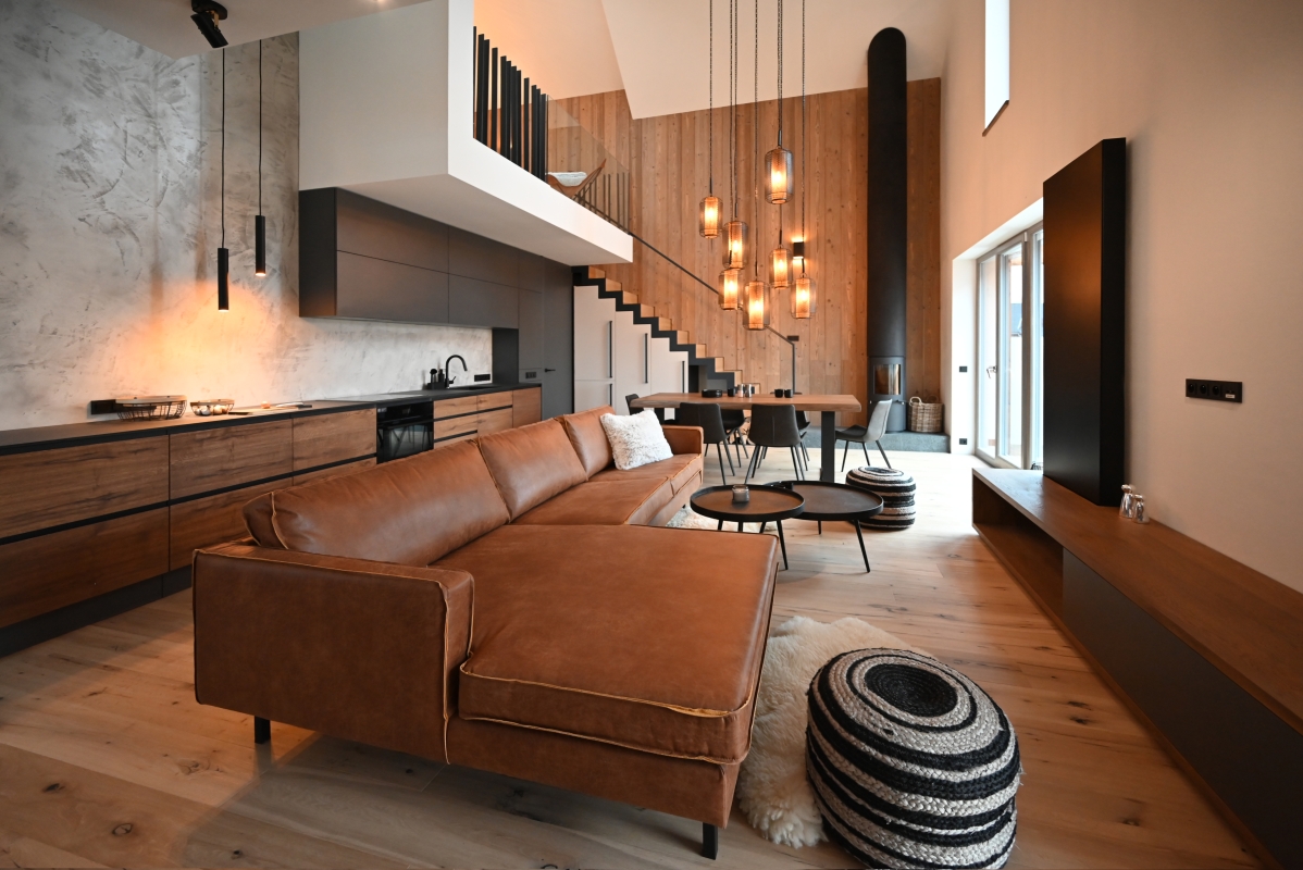 Na požádání klienta jsme přetavili standardní interiér nabízeného podkrovního 3kk bytu na velkorysý vzdušný prostor 2kk, který ale svým členěním poskytne dostatečné soukromí svým uživatelům. Prostor není využíván na celoroční bydlení, a tak si lze hrát s myšlenkou prostoru, který lze využít i pro setkávání větší skupiny přátel, ale stejně tak skýtá příjemný a útulný prostor pro své majitele, kteří si chtějí vychutnat chvíle odpočinku.