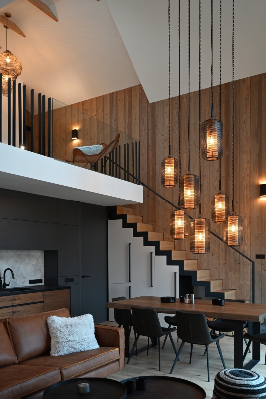 Světla svěšená z vysokého stropu jsou nutně upravena tak, aby podtrhla samotnou výšku a prostor. Vnímána jsou ze všech pohledů, jak z obytné části, tak z galerie, či průhledem z ložnice při otevření dvou zásuvných dveří.