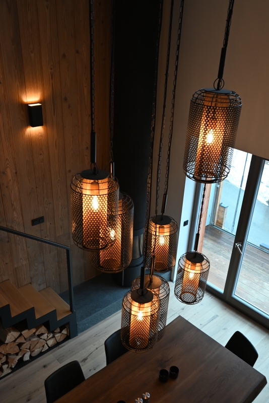Použité materiály, tedy dřevo, kov, kámen, kůže či kožešiny, a též plápolající oheň s vůní dřeva, navozují příjemnou horskou atmosféru podtrženou rozmanitým intimním osvětlením.