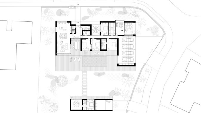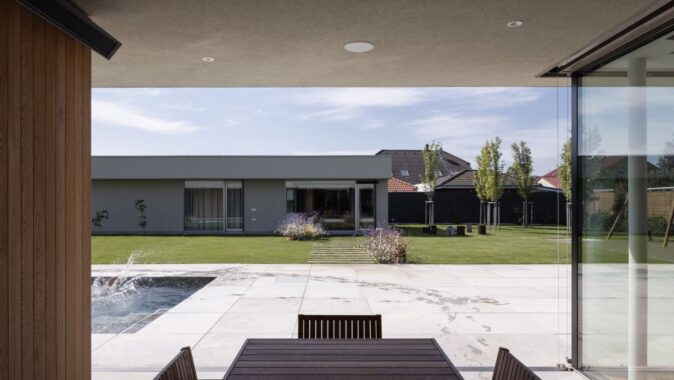 na terasu s bazénem. V ose vily jsme umístili zahradní domek. Slouží