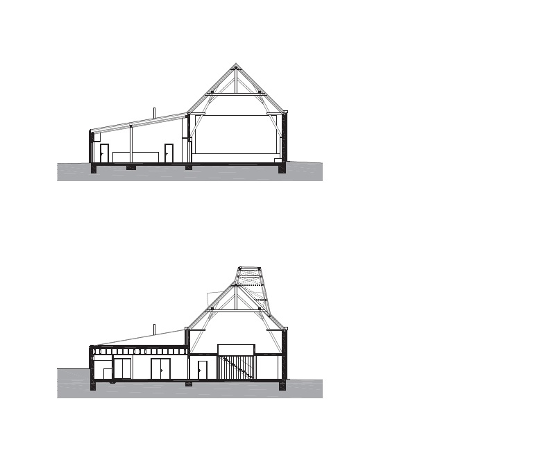 sedlovou střechu, dřevěná konstrukce krovu je v interiéru viditelně přiznaná. Přízemní