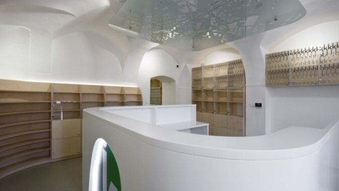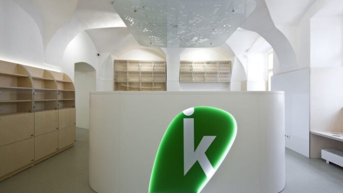 materiálem bělená přírodní překližka, která navazuje na klenby i stěny, takže místnosti