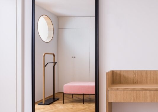 V rámci ozdravení dispozice jsme přehnaně monumentálnímu bytu nejprve uřízli kus obýváku a přidali pracovnu, hernu a hostovský pokoj v jednom, abychom jej usadili do praktičtější polohy pro rodinné bydlení. Tím přibyla další vrstva potenciálních životních konstelací připepřená možností prostor kdykoli monumentalizovat otevřením velkých posuvných dveří, které umí bezešvě zmizet za velkou knihovnou. Bydlení je pak krok za krokem vybavené nábytkem navrženým na míru bytu a jeho uživatelům: ať jde o jídelní stůl a lavici, šatnu či němého sluhu se zrcadlem, kuchyni, bar, pracovní stoly, ložnici nebo hrací kouty pro děti.
