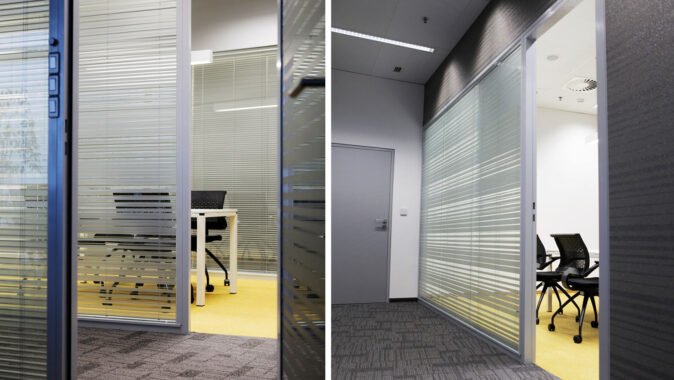 Na dispozici společných komunikačních prostorů (chodba s výtahy a schodišti) navazuje v námi řešeném, jihozápadním, křídle vstupní prostor. Jedná se o halu se solitérně pojatou, skleněným obalem obepnutou, recepcí uprostřed a zálivem se sezením pro návštěvy. Odtud lze pokračovat do prostoru s toaletami, místnosti s kuchyňkou nebo komory se serverem. Dvě komunikace vedoucí z haly hlouběji do křídla objektu řeší rozdělení podlaží na část se zasedacími místnostmi a kancelářskou zónu, přičemž dvě zasedací místnosti jsou situované v těsné blízkosti vstupní haly. Obě komunikace ústí do velkoprostorové kanceláře, kde jsme navrhli přístup do dalších tří menších, oddělených kanceláří.