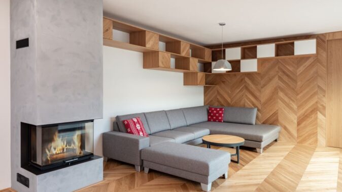soupravou je soustava polic se skříňkami, vedle ní krbová vložka. Naproti je