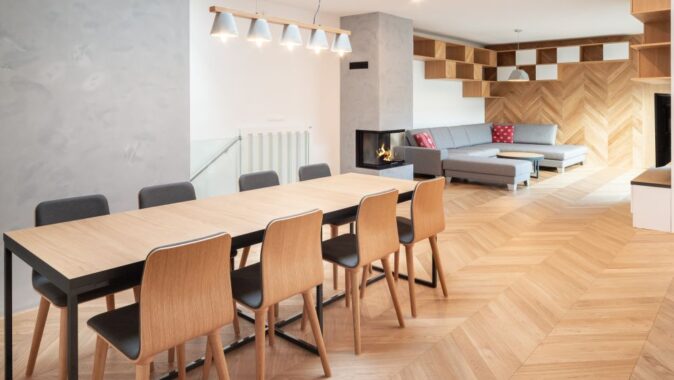 komoda s dřevěnými policemi a skříňkami. Dřevěné plochy na podlaze, stěnách a