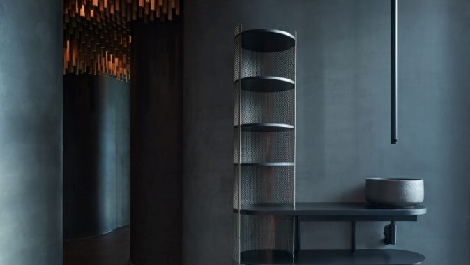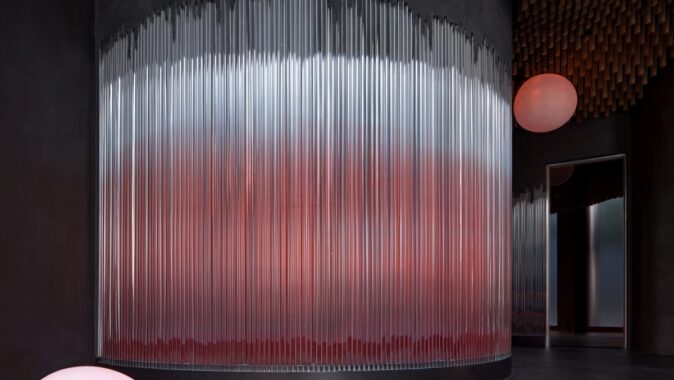 Malé kruhové šatny jsme pomocí půlkruhových zad z děrovaného podsvíceného plechu u zrcadel rozsvítili do hry světla a stínů opět s rastrem svislých pásků. Všechny tyto principy a materiály jsme zopakovali v dalších pozměněných formách po celém prostoru interiéru, abychom docílili harmonického celku.