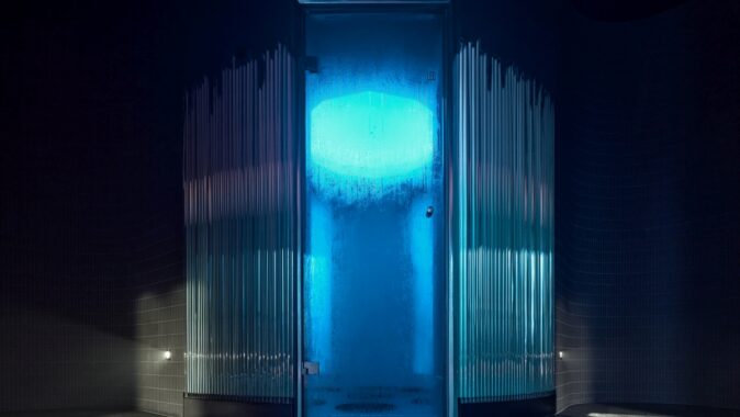 S principem vertikálního rastru pokračujeme v části SPA, kde jsme každou ze tří hlavních místností obložili skleněnými čirými tyčemi na gradientně stěrkované oblé SDK příčky. Účel místností není třeba zákazníkům vysvětlovat, samotná barevnost totiž definuje jejich náplň. Sauna jako oheň (červená), kryosauna jako led (modrá) a proudění vzduchu jako vítr (šedá).