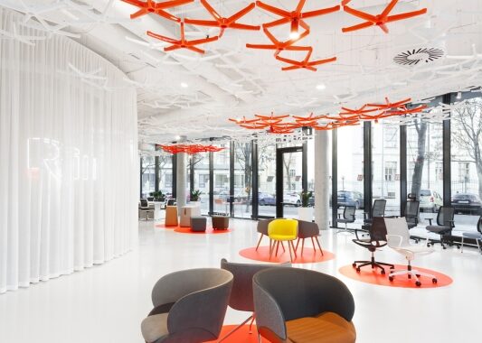 V původním showroomu nebyl dostatek místa na samotnou expozici a vystavený nábytek trpěl vysokou denzitou jednotlivých kusů. Proto se architekti při navrhování zaměřili na co největší otevření prostor, které následně neofenzivně rozdělili lehkým závěsem, za kterým je schováno vše, co se netýká výstavní plochy. Zásadní bylo najít vhodnou koncepci, která podpoří produkty a zároveň bude autentickým a charakteristickým způsobem reflektovat zaměření firmy. Vhodné řešení architekti nalezli v instalaci podnoží kancelářských židlí, které zavěsili pod strop. Tím se jim podařilo docílit identické aplikace. Z tohoto organického podhledu nakonec vytvořili jasnou dominantu prostor.