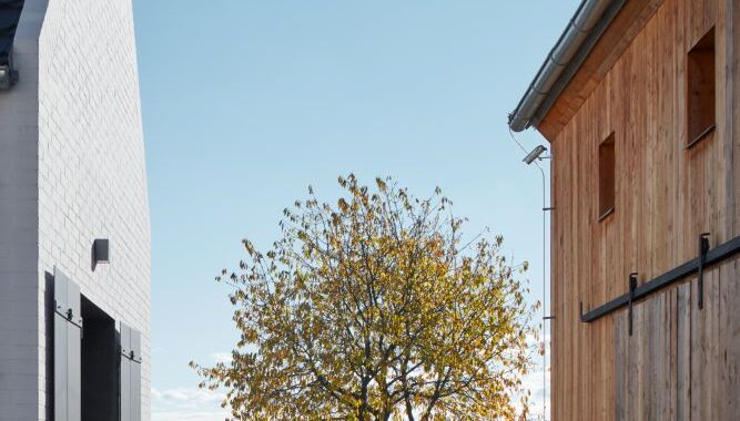 samotnou bylo zvoleno pohledové zdivo z plných cihel natřené bílou barvou jako