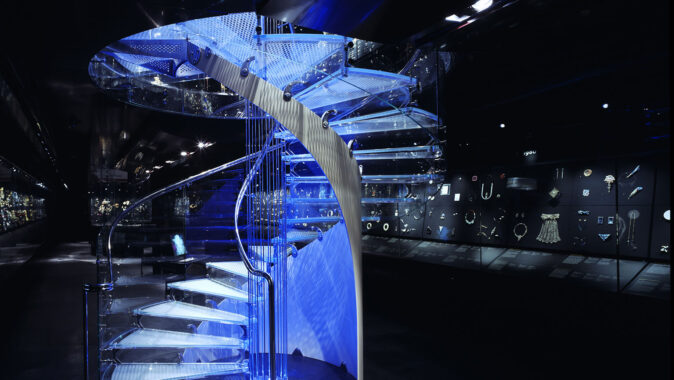 Expozice nabídne ukázky originální projektové dokumentace i architektonické modely řady významných realizací Evy Jiřičné. Těžištěm výstavy je monumentální skleněné schodiště vytvořené v roce 1994 pro interiér pařížské pobočky sítě obchodů Joan & David. Po uzavření pobočky na jaře roku 1998 bylo schodiště demontováno a díky osobní iniciativě pana Jiřího Kejvala převezeno do České republiky.  Po více než 20 letech bylo nyní zrestaurováno speciálně pro účely výstavy v Centru DOX.