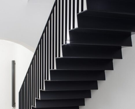 Suterénní expozice je průchozím labyrintem. Tektonika masivních stěn, průhledy,