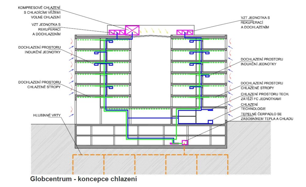 rastr prosklené fasády. Zadní spojovací část se schodištěm u Globcentra je navržena
