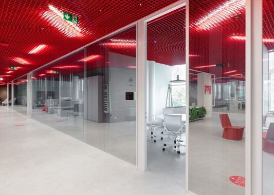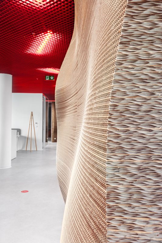 Jako další dominantní prvek celých prostor je zde pak červený hliníkový strop, nad kterým jsou taženy rozvody a umístěna prachotěsná LED svítidla, evokující logistické pozadí firmy. Pro potenciální budoucí úpravy ovšem zůstane strop přístupný a díky kazetám výrazně flexibilní. Barva stropu přímo odkazuje na korporátní identitu Zásilkovny, čímž se nám přirozenou cestou podařilo docílit signifikantního brandingu v celých interiérech firmy. Klíčové ovšem jsou také ostatní materiály, které v projektu používáme. Jejich kvality opět akcentují zelenou politiku. Jedná se totiž o recykláty, a to ve většině dostupných produktů. Od pracovních desek (deskový materiál z recyklovaného a vysokotlakem lisovaného papíru), přes lisované desky z dřevěných vláken, známé pod názvem Valchromat, až po řešení sedacího nábytku, který je navržen z recyklovaných plastů. V případě čalouněného provedení se jedná o ekologické látky, tedy materiály z recyklovaného PET. Na každém kroku se tak zaměstnanci či návštěvníci mohou setkávat s ekologickými produkty použitými systematicky ve všech prostorách interiérů. Ty tak nejen obohacují prostor svou specifickou estetikou a vybranou strukturou, ale zároveň mohou edukovat ty, kteří projeví o dané řešení zájem. Jde o vynikající marketingový nástroj.