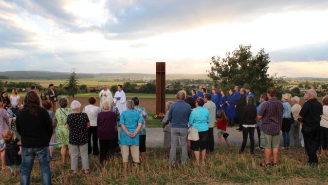 Záměr obce vybudovat tu drobný sakrální objekt, zaznamenaný v územním plánu prostým křížkem, získal konkrétní formu. Prolnutím dvou prostorových křížů vznikl jednoduchý objekt se čtyřmi výklenky. Kontext místa určil zasvěcení kaple čtyřem patronům. Zastoupeni jsou stylizovanými symboly orientovanými na všechny světové strany. Česká země: Svatý Václav – Svatováclavská koruna; letiště a vojsko: archanděl Michael – meč; pole a zemědělci: Svatý Isidor – rýč; cyklisté a výletníci: Svatý Kryštof – poutnická hůl.