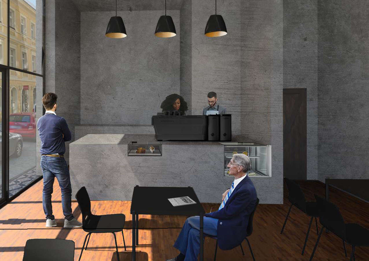 Dům stojí na křižovatce ulic Klimentské a Nové Mlýny. Na úzkém pozemku mezi stromem a vedlejším domem se nachází bytová stavba. Parter se propojuje s vnějším prostorem pomoci prosklené fasády. V něm se umístila kavárna, fasádu kterou lze v letě otevřít a tím zvětšit prostor, propojit s náměstím a se stromem.