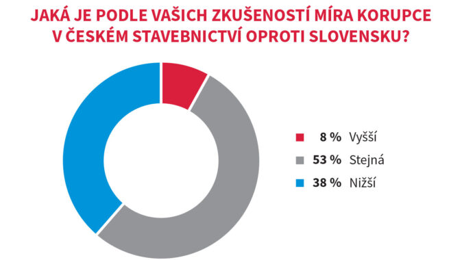 Příčinou korupce v oblasti stavebnictví je v ČR podle ředitelů stavebních firem celková špatná kultura prostředí a zneužívání postavení úředníky, přičemž na stupnici od 0 do 10, kde desítka představuje faktor maximálním způsobem přispívající ke vzniku korupce,ohodnotili ředitelé obě okolnosti shodnou známkou 7,1 bodu. Míru korupce dále negativně ovlivňuje prosazování příbuzných či známých do veřejných funkcí(6,6 bodu) a nedostatečná kontrola(6,1 bodu).Nejméně naopak ke korupci přispívá nedostatek zakázek (4,6 bodu).Míra korupce v českém stavebnictví je přitom podle poloviny (53 procent) ředitelů stejná jako na sousedním Slovensku. Další dvě pětiny (38 procent) uvádějí, že u nás máme v této oblasti korupci nižší. „Příčiny korupce v ČR jsou stejné, jako v jiných zemích. Je to vždy snaha získat výhodu na straně jedné a na straně druhé získat prospěch z možnosti tuto výhodu poskytnout. Míra korupce však závisí na mentalitě národa a úrovni společenského smýšlení, výchovy i hrozby postihů v případě jejího odhalení,“tvrdí Miroslav Lukšík, generální ředitel, Pozemní stavitelství Zlín a. s. „Špatný příklad vrcholných politiků z hlediska morálky, nedodržování zákonů a rozkrádání, různý metr na různé lidi a dotace,“ dodává Martin Hart, Marketing Director, KOMA MODULAR s. r. o.