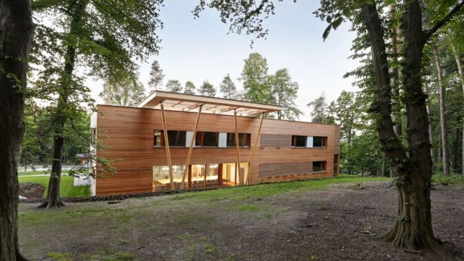 koncipovaná jako nízkoenergetická. Dřevěná fasáda a zelená střecha nechávají