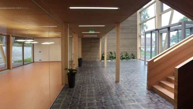 konstrukcí, zatímco vrchní stavbu tvoří dřevěný skelet. Prosklená hala dostala
