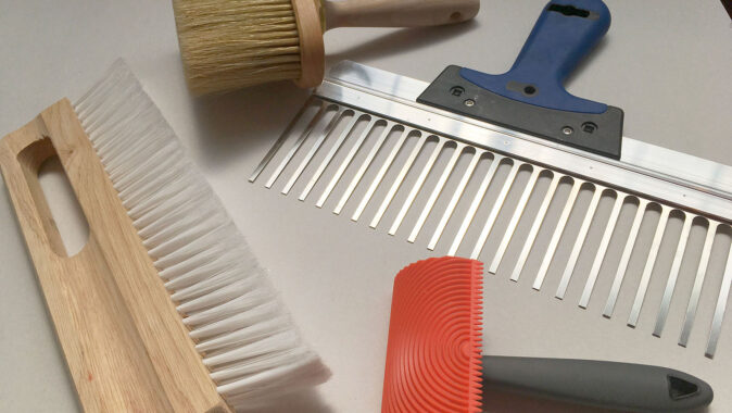 zubová stěrka, válečky, kartáče, stříkací pistole a jiné. Právě kombinace