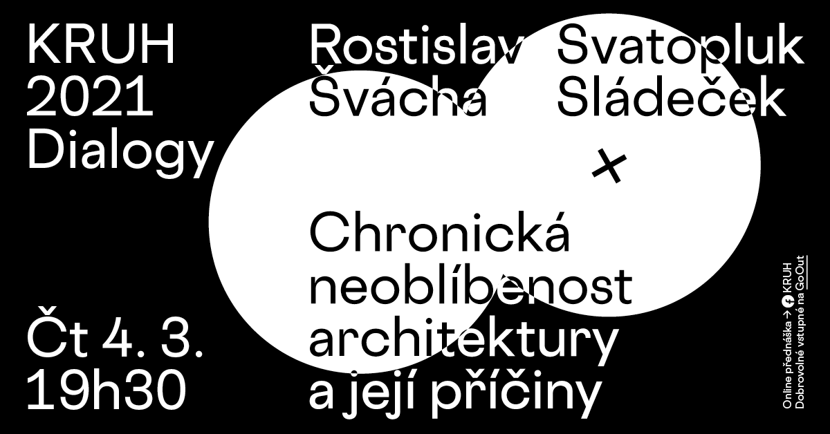 První přednáška v jarní části cyklu otevře dialog jednoho z nejvýznamnějších českých historiků architektury Rostislava Šváchy a svébytného architekta Svatopluka Sládečka, který tvoří převážně ve Zlínském kraji a jehož stavby se nazývají tzv. figurkativní architekturou. Jejich vzájemný rozhovor na téma Chronická neoblíbenost architektury a její příčiny se zaměří na neoblíbenost moderní architektury, na smysl architektury a její srozumitelnost v současné době. Večer bude doprovázen ukázkami vybraných staveb nejen Svatopluka Sládečka.