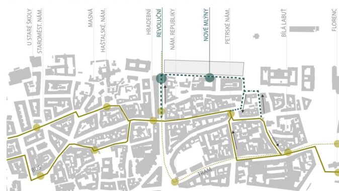 území z nároží ulic Revoluční a Lannova reaguje na historii Nových mlýnů a