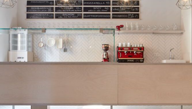 propojené s prostorem restaurace a také přímo na pultu, který tvoří ústřední