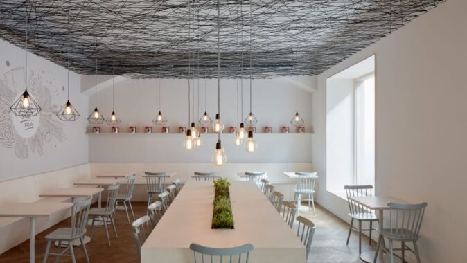 překližky. Celý interiér je doplněn osvětlením Edisonovými žárovkami a