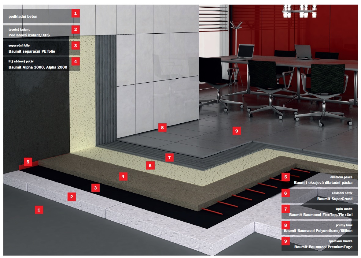 V případě, že se rozhodneme pro využití uceleného systému Baumit Baumacol v souvislosti se zavedeným podlahovým topením, je potřeba zvolit správný typ podlahového izolantu a zároveň dodržovat zásady pro zpracování a ošetřování litého potěru, který je dnes velmi častým řešením v rámci bytové i administrativní výstavby. Důvodem je efektivnější přenos tepelné energie z otopné soustavy do jednotlivých vrstev podlahy a následně do vnitřního prostoru místnosti. Pokud je podlahové vytápění realizováno formou odporového drátu, je optimální jeho umístění ve vrstvě samonivelační stěrky nebo přímo ve flexibilní lepicí hmotě pod keramickou dlažbou.