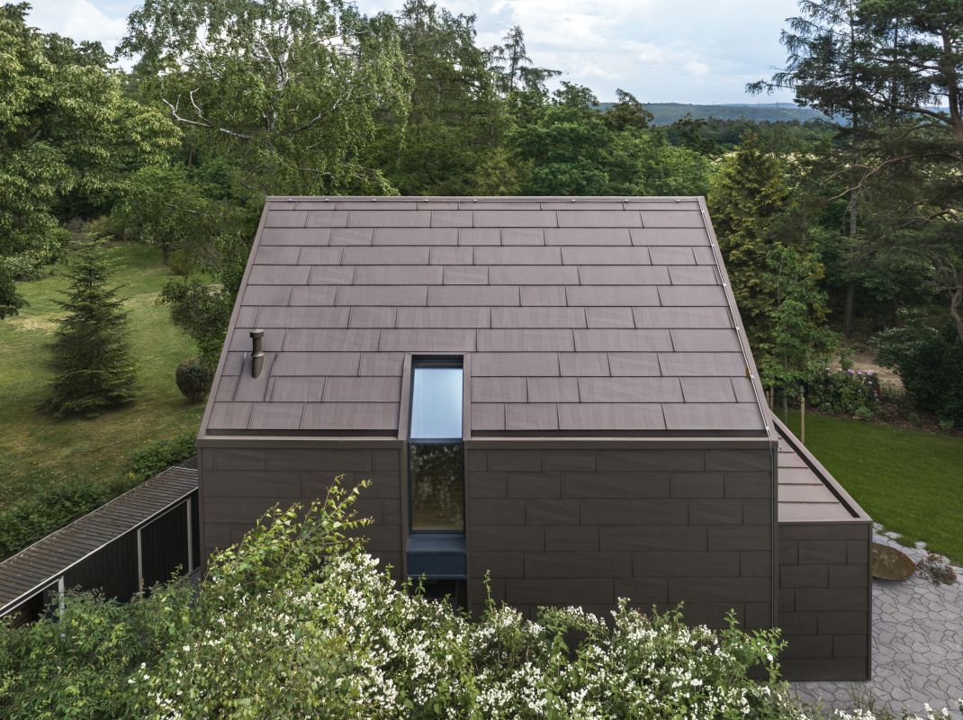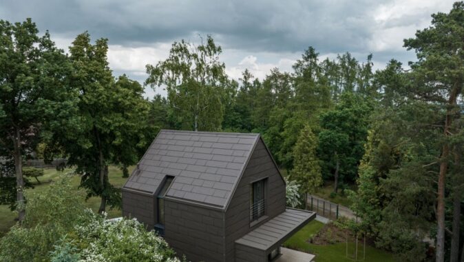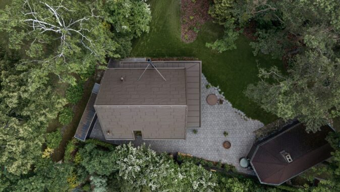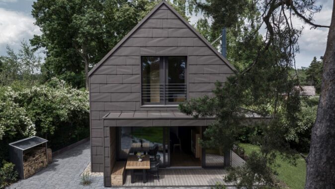 V okolí jsou nádherné vysoké jehličnany, které nás okouzlily a jejichž vzor se odráží ve fasádě. Ta je tvořena tmavě hnědými hliníkovými šablonami a svým tvarem připomíná šišku. Hliníkový povrch fasády zaručuje snadnou údržbu a dlouhou životnost a naplňuje zásadní požadavek na praktičnost.