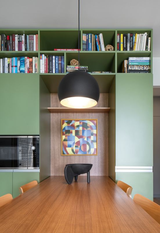 Hlavním tématem chaty je pohoda a odpočinek a tomu musely být bezpodmínečně podřízeny i provozní potřeby – prostory. Kuchyňskou linku jsme začlenili do obytné zóny tak, aby působila jako její přirozená součást. Proto jsme nad ni umístili knihovnu vrůstající do stropu a pro části skříněk zvolili sjednocující motiv dubového dřeva se stejnou profilací, jakou má stěna u krbu. Jídelní stůl se přirozeně včlenil mezi kuchyňské skříňky.