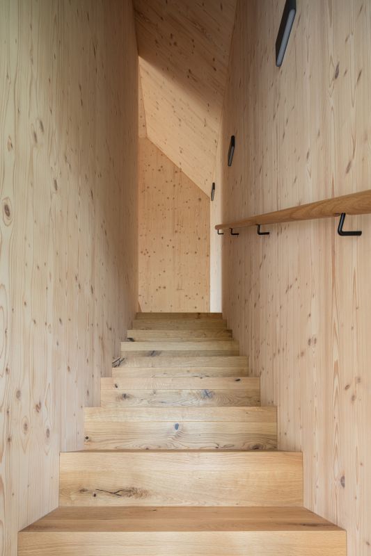 Cílem zadání bylo vytvořit prostor, který vyzařuje útulnost a teplo domova. Proto byl v interiéru hojně využit dub, konkrétně na podlahy, stěnu s krbem, jídelní stůl a židle. V ložnici a na schodišti zůstaly viditelné konstrukční CLT panely ze smrkového dřeva. Tento přírodní materiál přináší do interiéru teplý dojem domova a ušetří náklady na obklady.