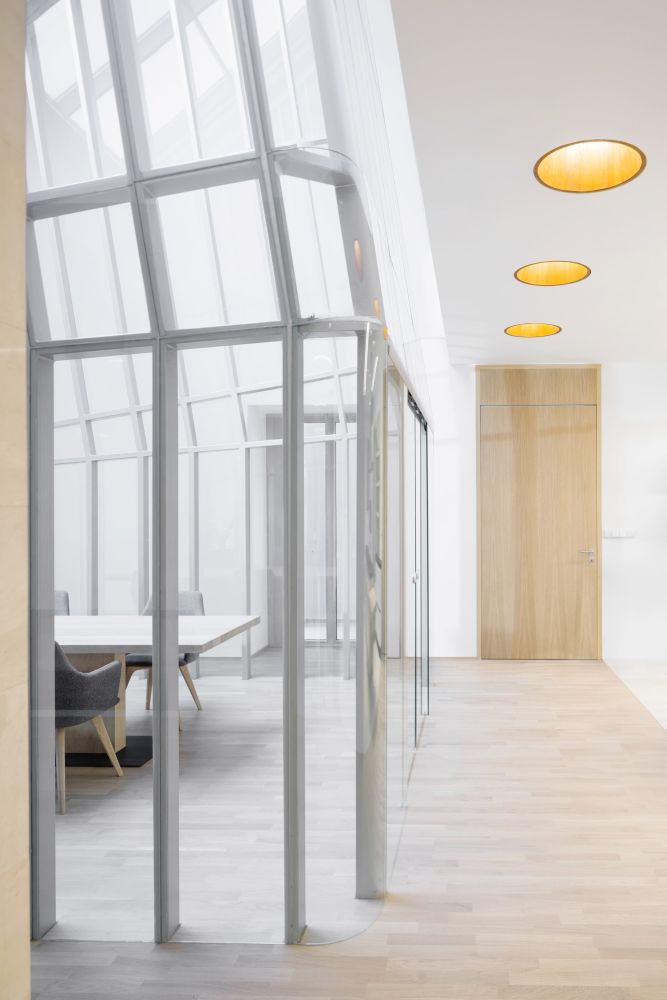 Původní dispozice byla vybourána včetně části stropu, aby vznikl plynoucí, jasně definovaný prostor s řadou prostorových zážitků. Společenská část s velkou kuchyní a jídelnou ve skleníku přes dvě patra je v kontrastu s bílými boxy ložnic tvořícími atmosféru intimních lesních obydlí drobného měřítka. Interiéry těchto ložniček jsou vytvořeny ze dřeva a kamene.