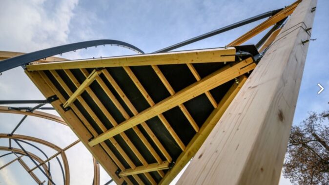 Dynamicky tvarovaná dřevěná lepená žebra i ocelové vzpěry tvoří prostorově