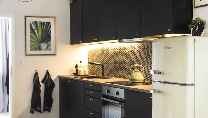 kachličkami s výraznou patinou a spotrebičmi vo vintage štýle. Zmiešaním