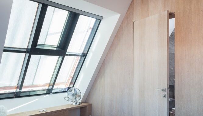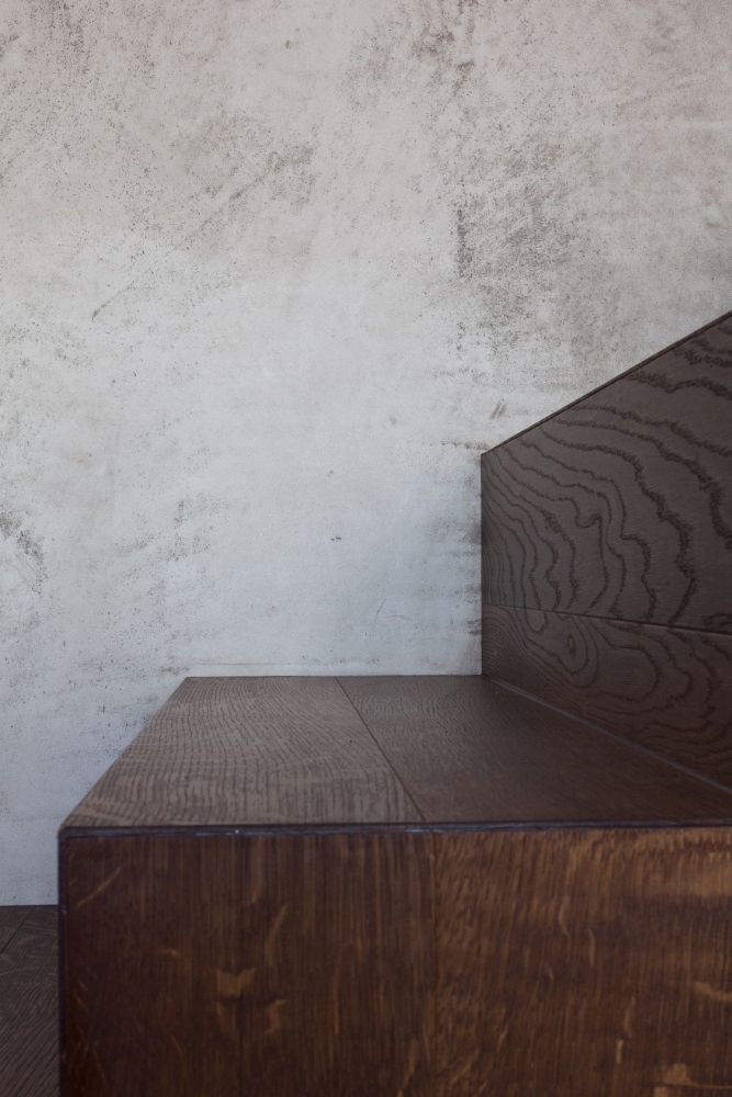 Tmavé dřevo schodiště plynule přechází do podlahy patra a kontrastuje tak s betonovou stěrkou centrální zdi s krbem i se světlým obkladem vestavěných stěn s úložnými prostory. V závěru schodiště přivádí sluneční paprsky malý světlík. V patře se opakuje prvek pódia, do kterého je zasazena postel a jehož část pod velkým střešním oknem slouží třeba jako čtenářský koutek. Za dveřmi integrovanými v dřevěné stěně se nachází koupelna s tmavým kamenným obkladem a dalším světlíkem.