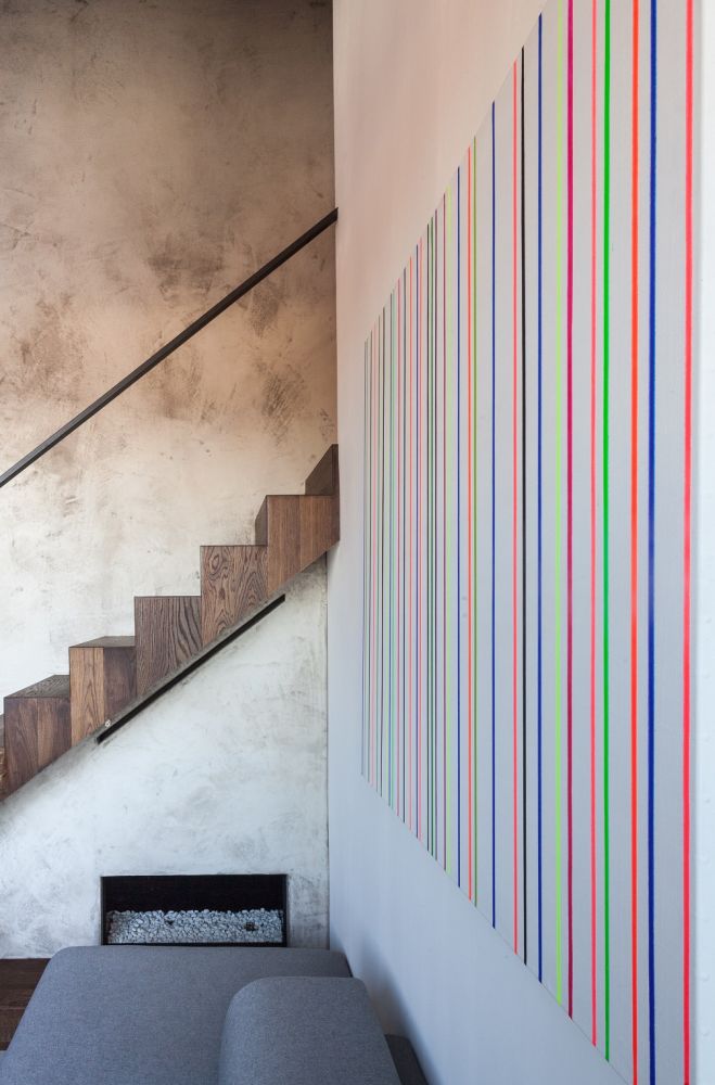 Prostor bytu charakterizují také atypicky řešené prvky, které najdeme třeba v posuvných dveřích oddělujících předsíň nebo nerezových madlech skříní s jemným detailem vyfrézované drážky. Interiér doplňují umělecká díla významných českých malířů, zejména nápadná abstraktní malba Evžena Šimery.