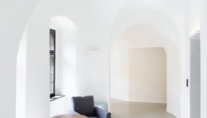 světlem, pro kterou se autorka inspirovala ve scénografii. Bílá omítka