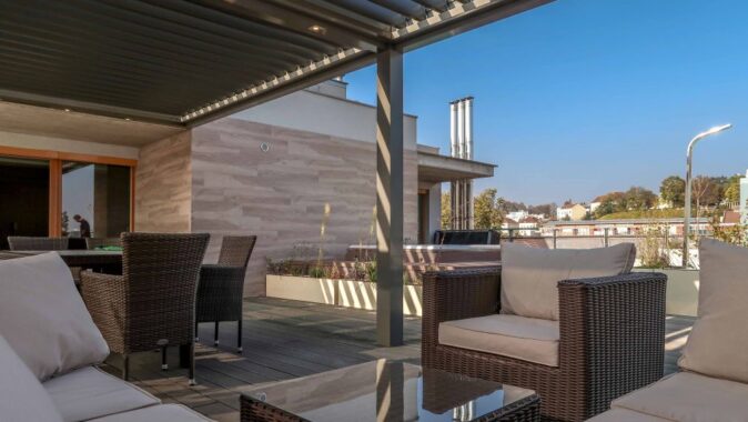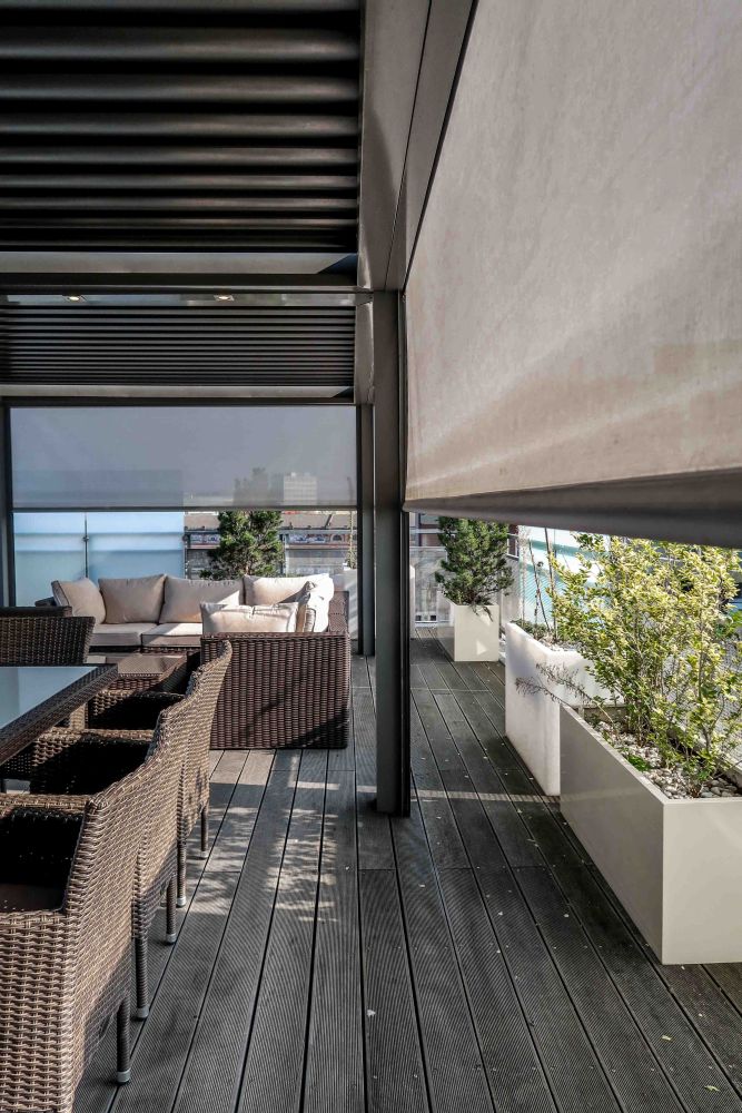 screenovými roletami, které zabraňují pohledům ze sousedních domů. Pod pergolou