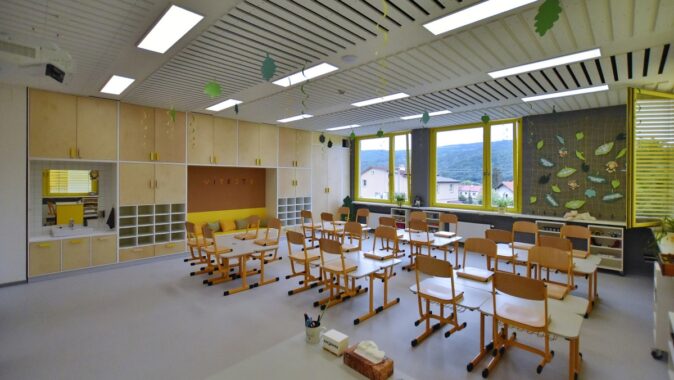 Mateřská škola zahrnuje tři oddělení s nezbytným zázemím. Základní škola je určena pro první stupeň a obsahuje šest shodných čtvercových učeben s okny vždy po dvou stranách. V přízemí jsou umístěny šatny a také jídelna s kuchyní, která slouží pro mateřskou školu.