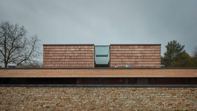 pískovce a štípaného modřínového šindele odkazuje k historii a materiálům
