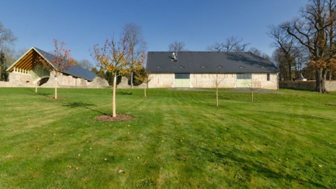 Kompozici hlavní budovy vůči nádvoří doplňují dům hospodáře (neboli byt správce) a oranžerie s nově prosklenou částí. Stodola po obnově slouží jako komplexní hospodářské zázemí. Konírna získala novou nápň jako prostor pro příležitostné veřejné společenské akce. Její formu jsme ponechali v co nejtorzálnější podobě – nechali jsme zaznít krásu monumentálního kamenného neomítnutého zdiva a dlouhou vnitřní klenbu s dochovanou původní dlažbou. Konírnu jsme pouze doplnili o nezbytné hygienické zázemí a novou sedlovou střechu. Kompozici nádvoří jsme u hlavního vstupu uzavřeli novou budovou kočárovny s novodobým abstraktním tvaroslovím, které ovšem vychází z formy klasických pilířových kočároven..