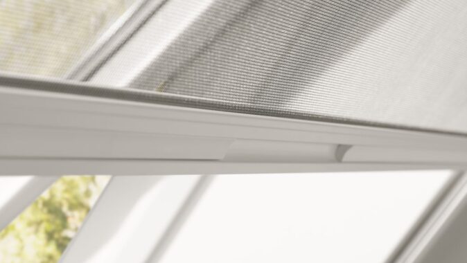 Nová síť proti hmyzu má moderní bílý vzhled, který dokonale ladí se střešními okny VELUX. Když síť právě nepoužíváte, zůstává nenápadně srolovaná v subtilním horním pouzdře. Elegantní štíhlé profily vizuálně splývají s ostěním, což síť dělá téměř neviditelnou. Průhledná tkanina nijak nenarušuje výhled, je odolná vůči větru a má dlouhou životnost.