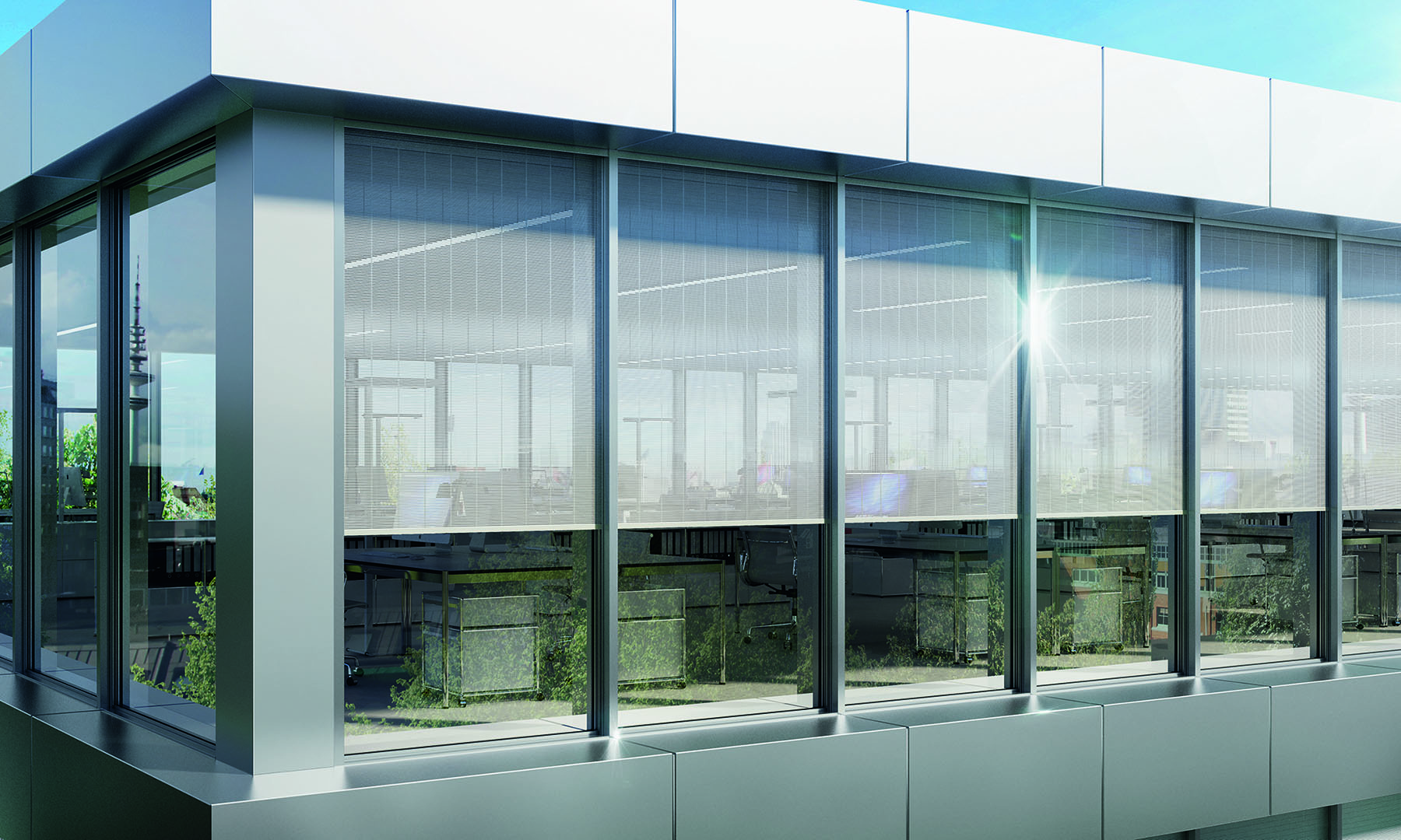Venkovní sluneční clona Schüco CSB je plně integrovaná do fasádního