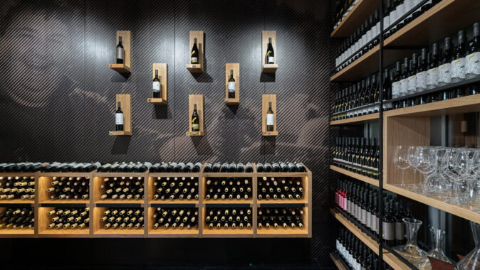 nanesené vzory z vinných etiket. Prostor doplňují dubové police, stoly a